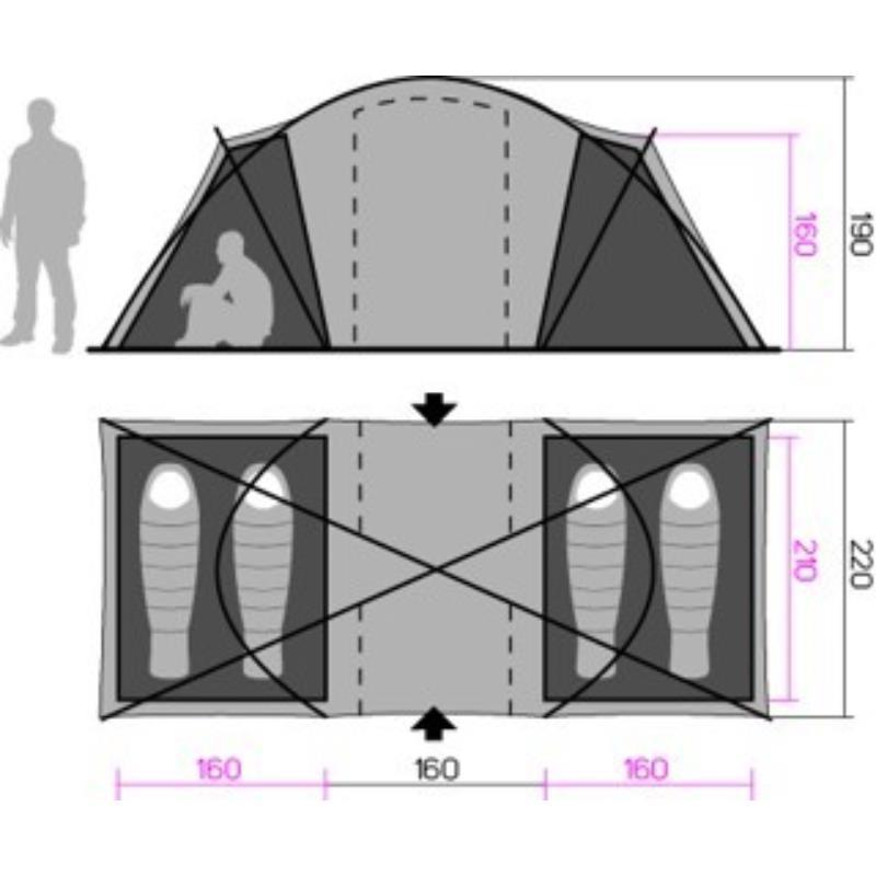 Prostoren šotor z dvema spalnima prostoroma je primeren za 4-6 oseb, ki uživajo v kampiranju.