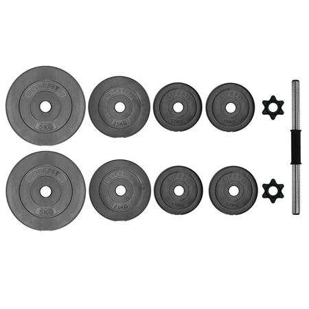 Edinstven in cenovno ugoden komplet plastičnih uteži za vadbo s cementnim polnilom. Gred je narejena iz visoko kakovostnega kovinskega materiala in je premera 30 mm, kot je običajni evropski standard. Ročaj je izdelan iz utrjene plastike z nedrsečim zaključkom. Navoji na obeh koncih gredi in dva plastična tulca zagotavljata varno pritrjevanje. Velika variabilnost uteži omogoča številne vrste vadb za vse kategorije zmogljivosti uporabnikov.